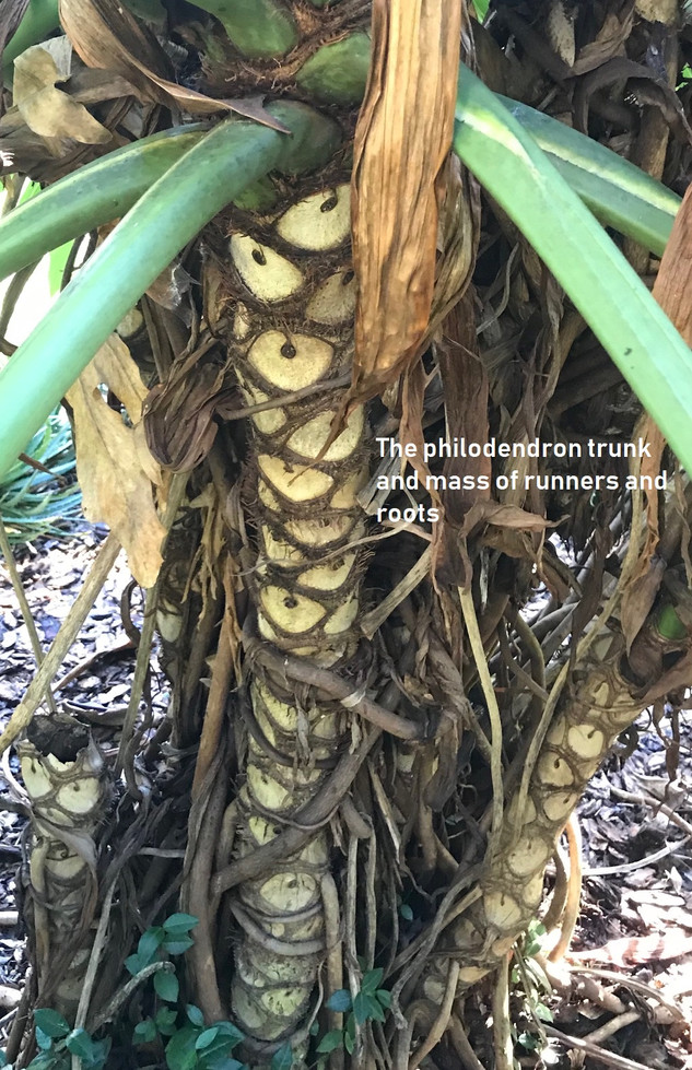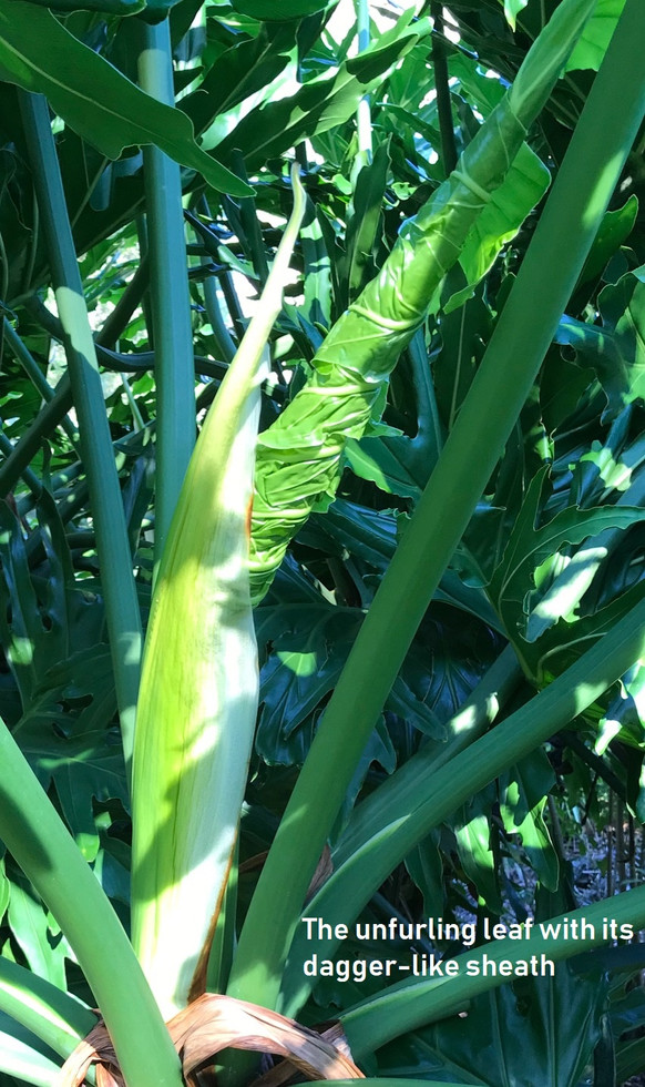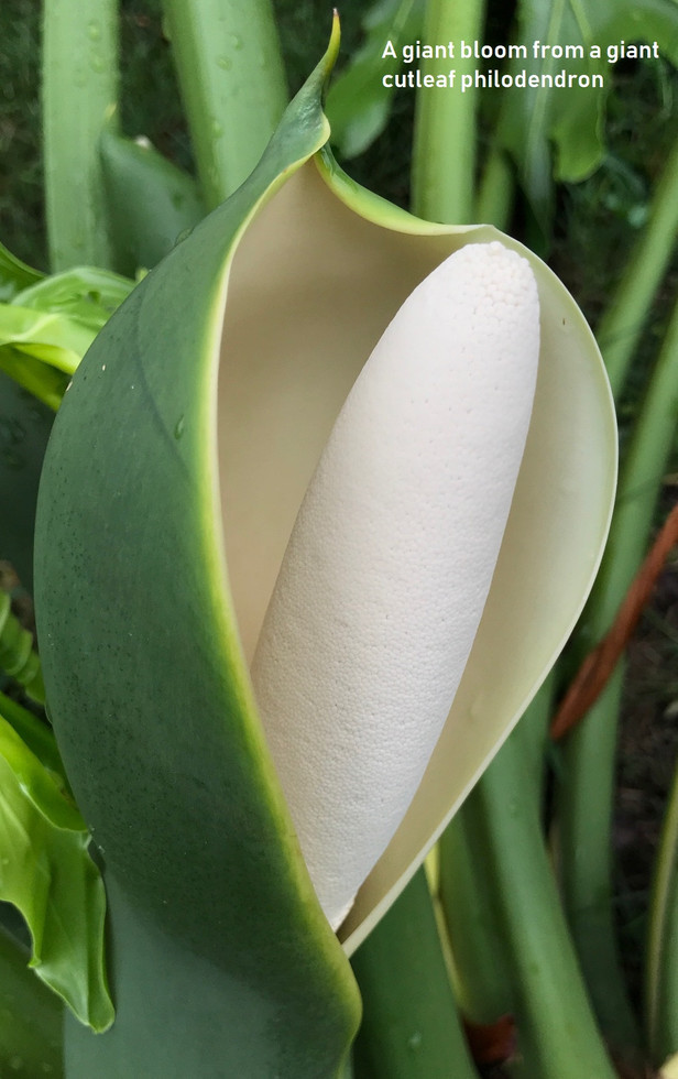 A plant serving as one of the foundations of our Florida Home’s gardens is the CUTLEAF PHILODENDRON. Growing up in Wisconsin, I was always impressed by the huge leaves, as well as their need to stay warm, so they stayed indoors there as a small houseplant. When we moved into our Florida Home, we had three enormous plants: One covering about half the front of the house; two more in the back of the house, more than eight feet tall and 20 feet wide. They make a fine natural barrier around the pool. The are very sensitive to the cold and will die back to almost nothing, only to grow back entirely. They are home to lots of critters. The leaves are deeply invaginated, with the main trunk sending down long root-like runners. Their buds are like daggers. They bloom in the spring with a bright white stamen. We also have a smaller cutleaf with a darker leaf that makes a three foot mound and lives in the shade of the Palm Row. These large plants take up lots of room but add to the tropical feel of our Florida backyard.