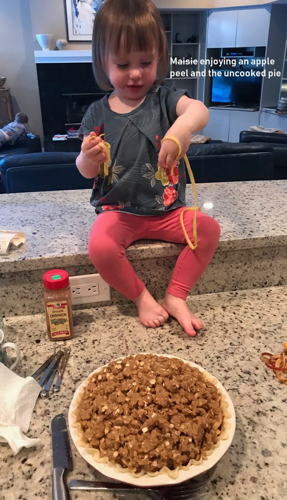 The Thanksgiving Holiday was a busy time at our Florida Home with both sons and their families visiting for most of the week. TAProots farm contributed maple syrup for the pancakes, juicy pink and red grapefruit for breakfast, tangerines for the grandchildren’s lunch, and a bottle of 2012 Dry Riesling from Ravines Winery. The lovely warm days and cool nights were perfect for bike riding, visiting the zoo and butterfly museums, playgrounds, picking oranges, and of course swimming in Nonny and PopPop’s pool. One celebration involved Caroline, Alex’s wife, making her famous apple pie for Thanksgiving dinner. For this, help was provided by the two four-year-old cousins, Cora and Graham, supervised by Maisie, aged 2 years, who watched intently from the ledge of the counter where she perched for the whole event. First, Cora stirred up the cinnamon and sugar, while Graham cranked the apple peeler. Second, huge pile of slices then were mixed with the cinnamon and poured in the pie crust. Third, the oatmeal, pecan, and brown sugar topping was dropped over the pie. During all of this, Maisie got hungry and was consuming four foot long apple peels like spaghetti. The pie came from the oven a golden brown and so delicious. What fun for all at a TAProots Thanksgiving.
