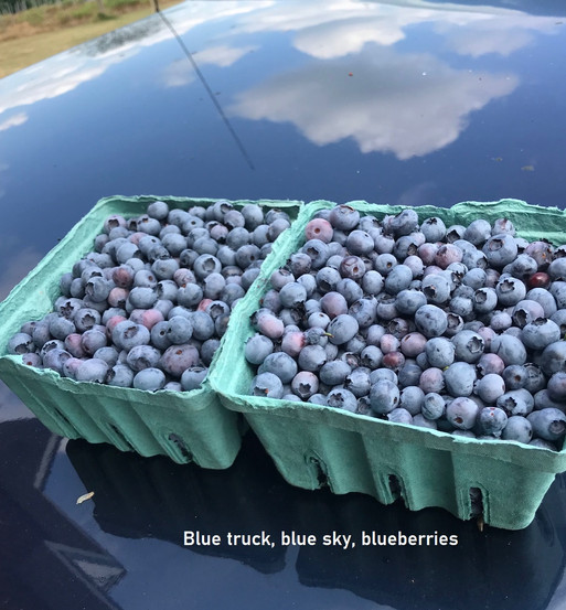 It is BLUEBERRY time at TAProots farm. The mild spring allowed a heavy bloom on the blueberry bushes, followed by a very dry June and hot weather with showers in July. This, along with weed control and some organic fertilizer, lead to a heavy crop of blueberries this season. The seven rows are planted for sequential ripening but the hot weather brought almost everything to harvest. Some berries were very small due to the drought, but others weighted down the mature bushes with unripened fruit. We picked many quarts for our neighbors, blueberry pancakes, and Joyce’s blueberry pie, all in the first weeks here. Something we didn’t have in previous years was enough fruit for jam. Not this year! I made one batch of blueberry freezer jam to see what that is like, but the real target is cooked blueberry jam that can return with us to Florida. Each batch needs two quarts of berries so jam-making will continue as long as the berries holdup. Picking needs to be done every day or so, since birds also love blueberries. As the season progresses, it’s us against the birds!