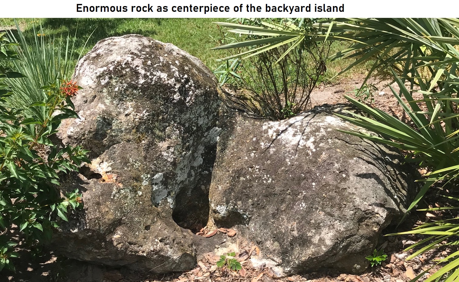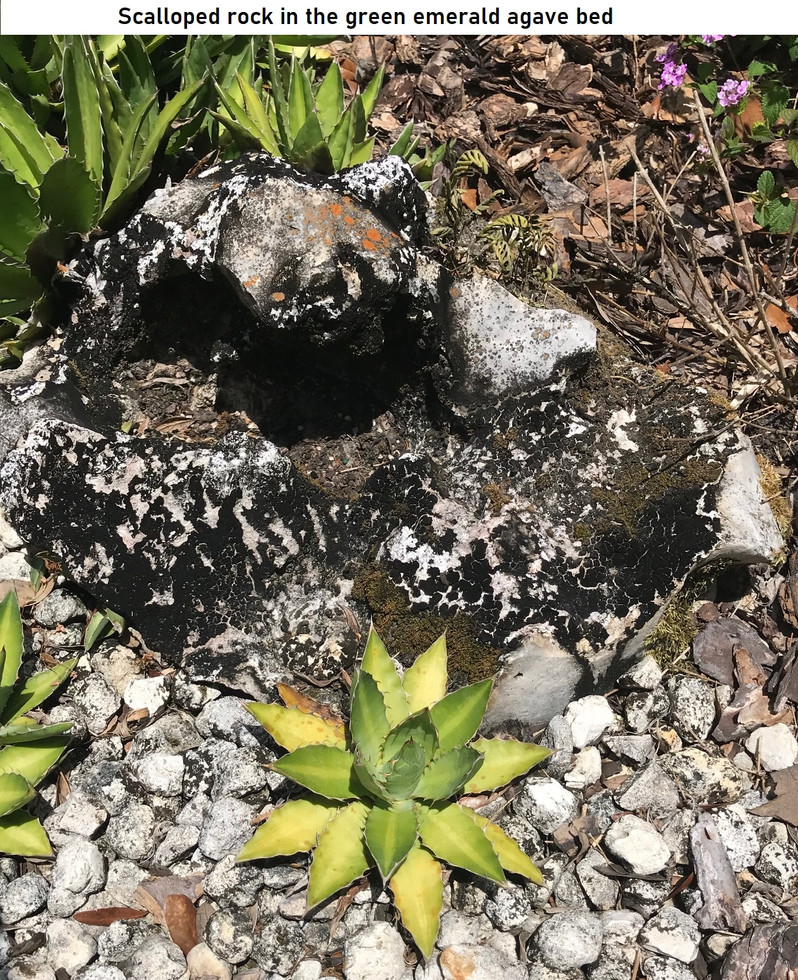 Both Joyce and I are big fans of STONES to add interest to the garden. Our lakehouse has huge stonewalls, waterfalls, walkways, etc. Our Florida home is more subtle, with stones used to add character to our front plantings and to the island of plantings in the backyard. The large garden stones in Florida consist of karch, from ancient coral reefs left high and dry as the sea level fell. Consequently, the stones are interesting, often with embedded shells and many nooks and crannies. They are a light gray to cream in color, and easy for moss and lichens to cover them. Our stones along the front walk add interest to our huge agave as well as the small green emerald agaves proliferating next to the lawn. Another two are covered with shaggy green moss as they serve as a barrier to the aloes’ vigorous spreading. In the island of plantings in the back yard, a huge rock probably 800 pounds, is the centerpiece covered with lichens. Underneath it is Mr. Armadillo’s house, from which we tried numerous times to evict him, never successfully. Several other rocks are nestled amongst the saw palmetto, fire bush, and Pentas. A couple form a place to provide a dish of water for the birds. Our stones are easy to overlook, but they add some interest to the shrubs and perennials and perches for all sorts of critters.