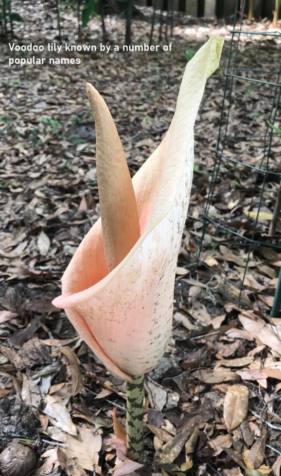 The dry spell has ended for the Florida Garden, with warm humid days punctuated by an afternoon shower, and even a rainy day every so often. Everything seems to be blooming, including some odd plants added to the garden over the past year. This blog will feature the VOODOO LILY, a truly bizarre plant that I purchased from the grower who sells plants at the Farmers Market. I bought the plant for its umbrella like foliage and it’s avidity for shade. I planted it in the far corner of our yard by the large spiral and pinecone gingers. I watered it for a couple of days then missed a couple of days to find it withered, dying back to the ground. I thought I had lost it, and even planted a redbud tree nearby to occupy the vacant spot. This spring, to my surprise, a large, quite pretty, sack-like leaf emerged which then opened up to a thick, vase like bowl with a ivory round stamen about 8 inches long in the middle. It continued for 4-5 days, when the stamen turned black and the bowl collapsed. The whole thing is starting to smell bad, like rotting meat—thank goodness it is far from the house. Voodoo lilies are from the Amorphophallus family and I am quite sure ours is A. Bulbiser. They are native of East and South Asia..There are 170 or so species. They are remarkable for several things. First, they have a huge list of common names, mostly referring to their appearance resembling the interaction between male and female genitalia, “Lords and Ladies” being a modest example. Second, they bloom, die back, then leaf out months later. Third, they attract dogs and other animals to their smell of rotting meat, but are very toxic. It appears that I need to watch this Voodoo lily carefully, as I don’t know what will happen next!