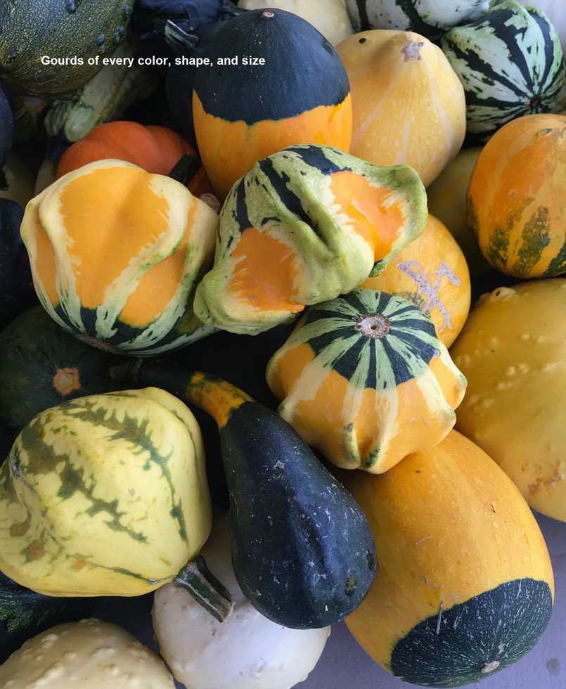 Harvest time at TAProots farm included one new project for 2019: THE GOURD TRELLIS. This idea dates back several years when I asked my neighbor to the south, Jason Elliot, about the horses stabled in his barn, specifically about their manure. This led to a load of manure being dumped just west of the raspberry patch, for which the manure was intended. Not only did the berries love the manure, but Jason had tossed an old pumpkin into the pile, leading to a pumpkin patch. With that success, last year Jason delivered a huge load, measuring 75 feet by 8 feet. In May, we placed four trellis posts and hung trellis wire every 18 inches, and planted four packets of different kinds of gourds. When we returned in June, the trellis was covered with green vines and yellow blossoms. Gourds of every color, shape, and size formed along the trellis, to the point the wires were sagging with the weight. At the harvest, the entire bin of Smokey, the Polaris ATV, was full of gourds. They were washed off and covered the entire top of the picnic table. Neighbors, friends, and both sets of grandchildren got boxes of gourds and a box was mailed to the Florida home for our autumn decorations. It looks like gourds will be an annual crop at TAProots farm.